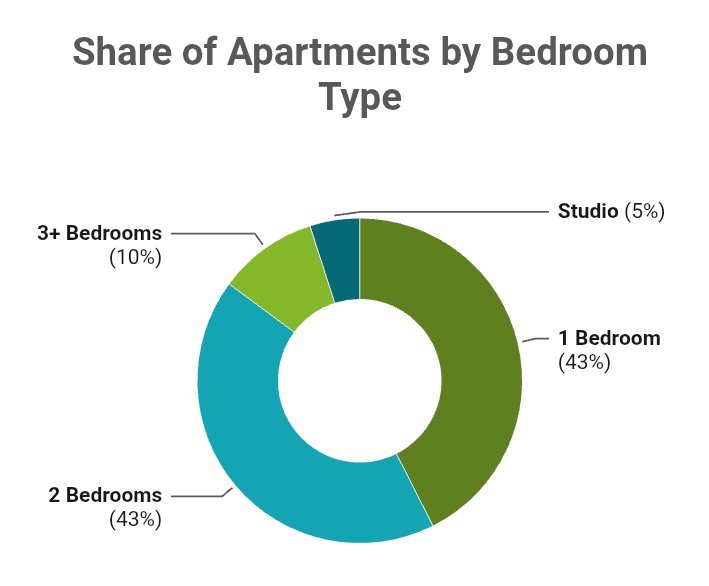 The chart above displays the makeup of apartment units by number of bedrooms. We can see that compact sizes like one and two bedrooms are the most popular. What we’re offering is a product of similar size, but with even more freedom as our communities give each resident their own lot with outdoor space in addition to the interior space of their unit.
